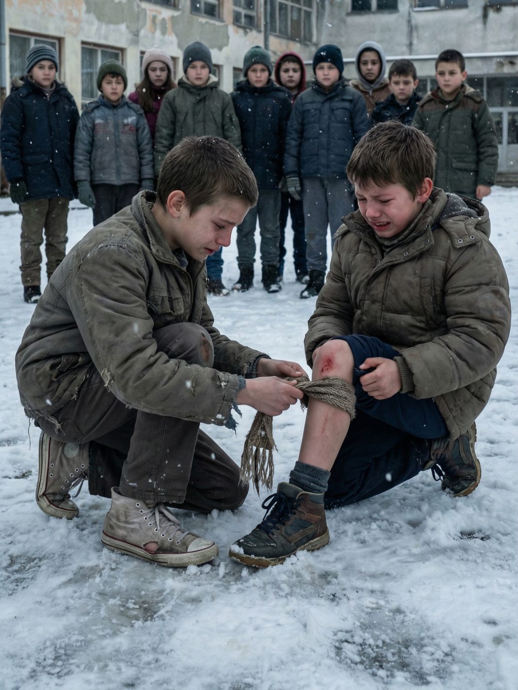 Jednog dana, dok je sneg padao, Marko je došao u školu sa novim, skupim patikama koje su blistale belinom. Dok su se svi okupili oko njega, divili se i pitali koliko su koštale, Nikola je samo ćutke prošao pored, pazeći da niko ne vidi mokre čarape koje su mu se lepile za kožu. Tog dana, ipak, nešto se promenilo. Marko je, dok su se deca gurala niz zaleđene stepenice, pao i udario koleno o beton. Svi su stali. Neki su se smejali, dok su drugi samo gledali. Nikola je, međutim, bio prvi koji je prišao. Kleknuo je pored Marka, skinuo svoju tanknu maramu i obavio je oko njegovog povređenog kolena, pokušavajući da zaustavi krvarenje. „Nemoj da stojiš, ohladićeš se“, rekao je Nikola tiho, pomažući Marku da ustane.