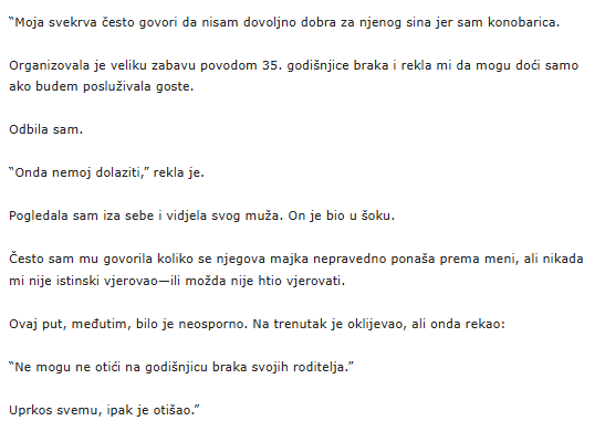 - U ovoj situaciji, unatoč stalnim napadima, žena je odlučila boriti se za svoju sreću i dostojanstvo. Pokušala je ignorirati uvrede i usmjeriti energiju prema svojoj obitelji, svom partneru i, naravno, svojoj profesiji. No, duboko u sebi osjećala je da su sve te kritike samo odraz nesigurnosti i nezadovoljstva koje su nosili njezini svekrva i svekrva. Ova priča ističe kako je važno da se ne predajemo tuđim mišljenjima i da svatko od nas ima pravo na svoju sudbinu, bez obzira na to kako nas drugi vide.