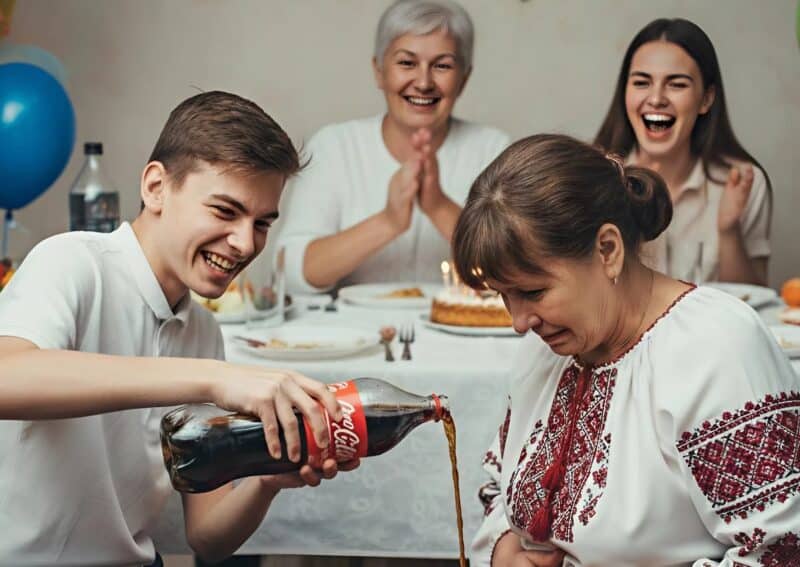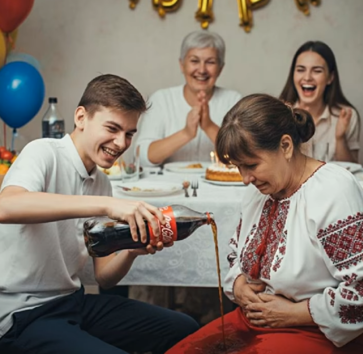 Na tom slavlju, njezin nećak Ilja je, očigledno željan pažnje, odlučio prići svojoj teti s bocom cole i bez ikakvog upozorenja, polio joj cijeli sadržaj na koljena. Glasni smijeh ispunio je prostoriju, a rodbina je počela pljeskati i hihotati.
